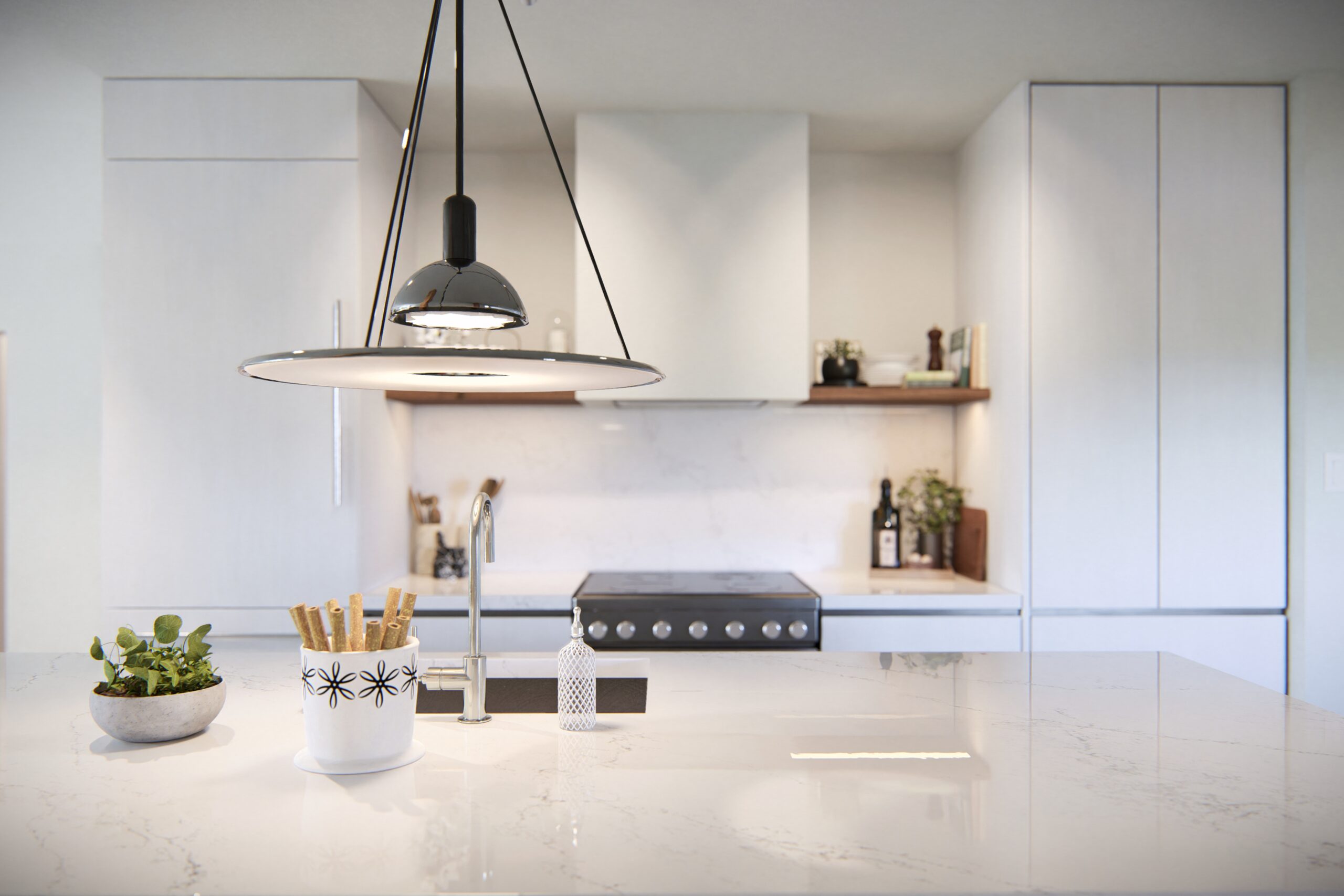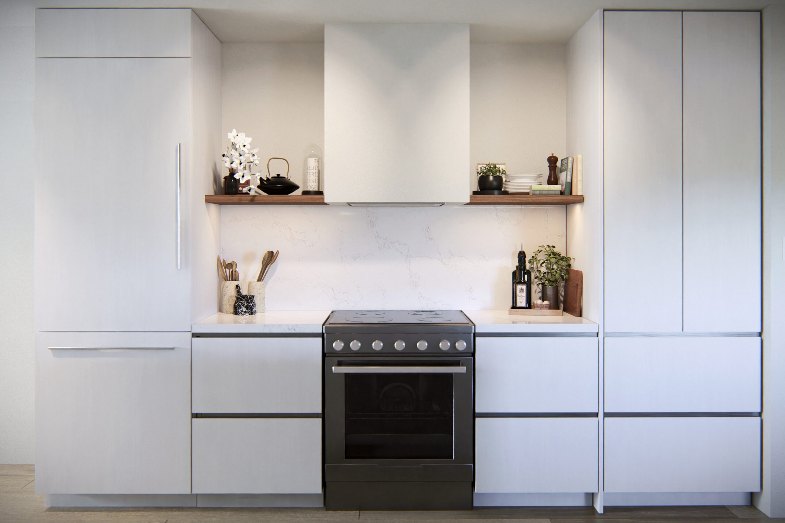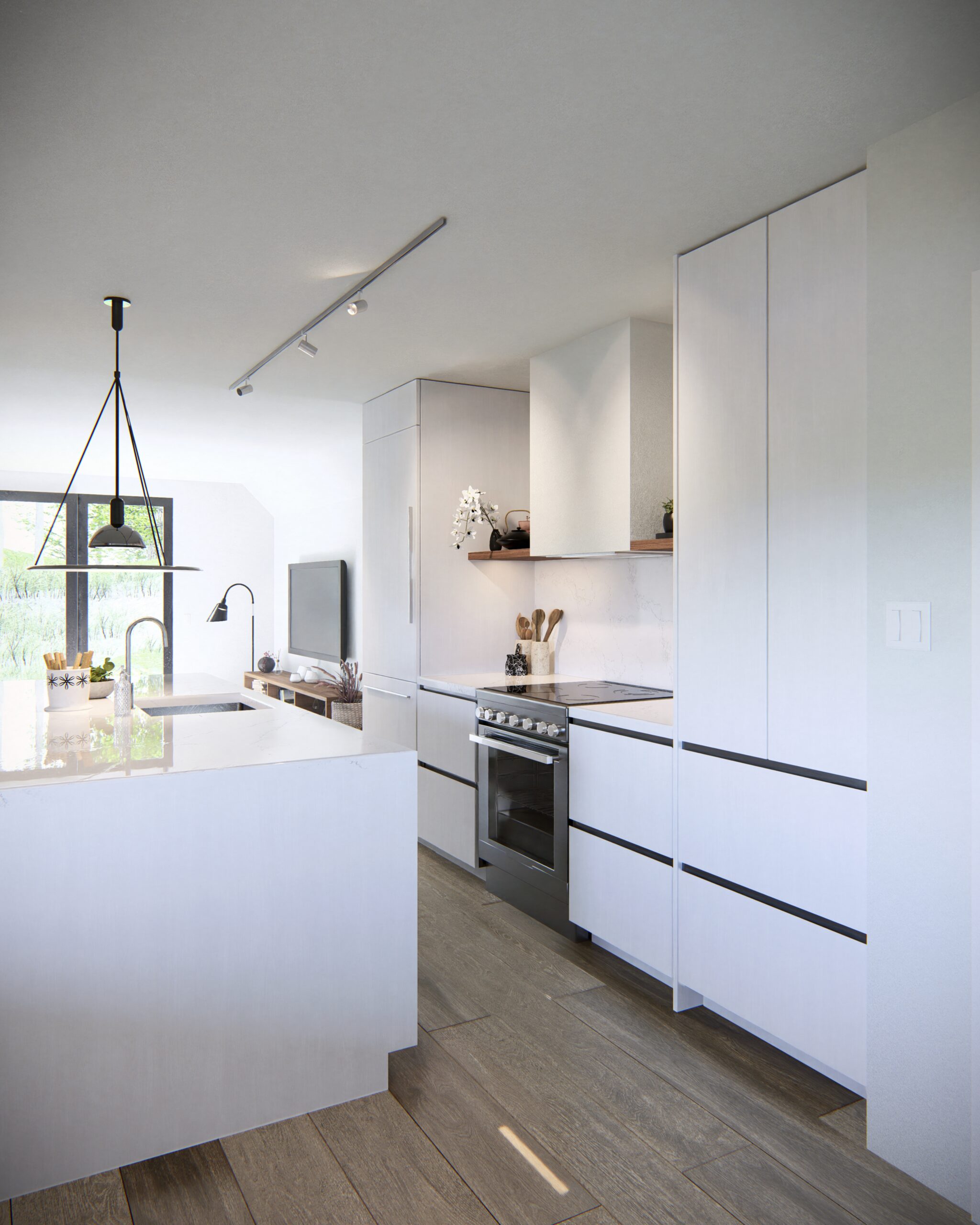 Every element—from the subtle grain of the wood floors to the integrated lighting and concealed storage—was designed to balance elegance with function. The result is a modern retreat that feels both calm and connected to its alpine surroundings.